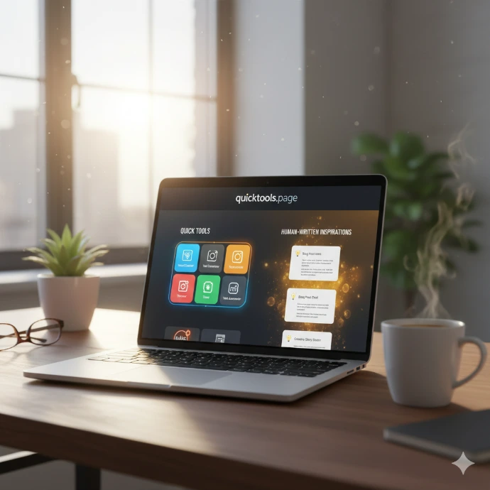 "In the rush of the digital world, speed often comes at the cost of soul. At quicktools.page, we believe you deserve both. We blend the efficiency of smart, reliable tools with the irresistible warmth of human-style writing inspiration. Stop settling for robotic text and clunky processes. Get your tasks done faster, smarter, and with a voice that truly connects.